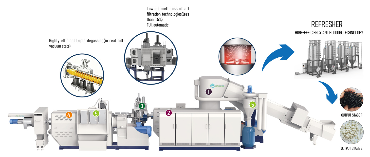 Post consumer recycled pellets of the future can do more. Get more out of your material stream with featuring digital assistance systems. More quality, more productivity. For a beter end product. Take the new energy saving dual filtration solution (automatic belt melt filter+back flusher filter), for example, as well as refresher anti odour technology.